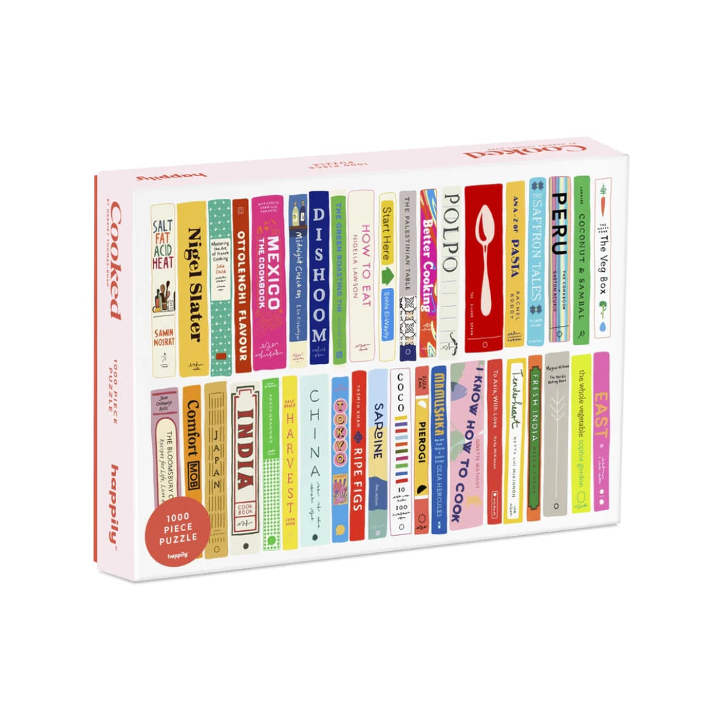 1,000 piece book puzzle featuring illustrations of popular cook book spines by acclaimed illustrator Harriet Thomas-Bush.