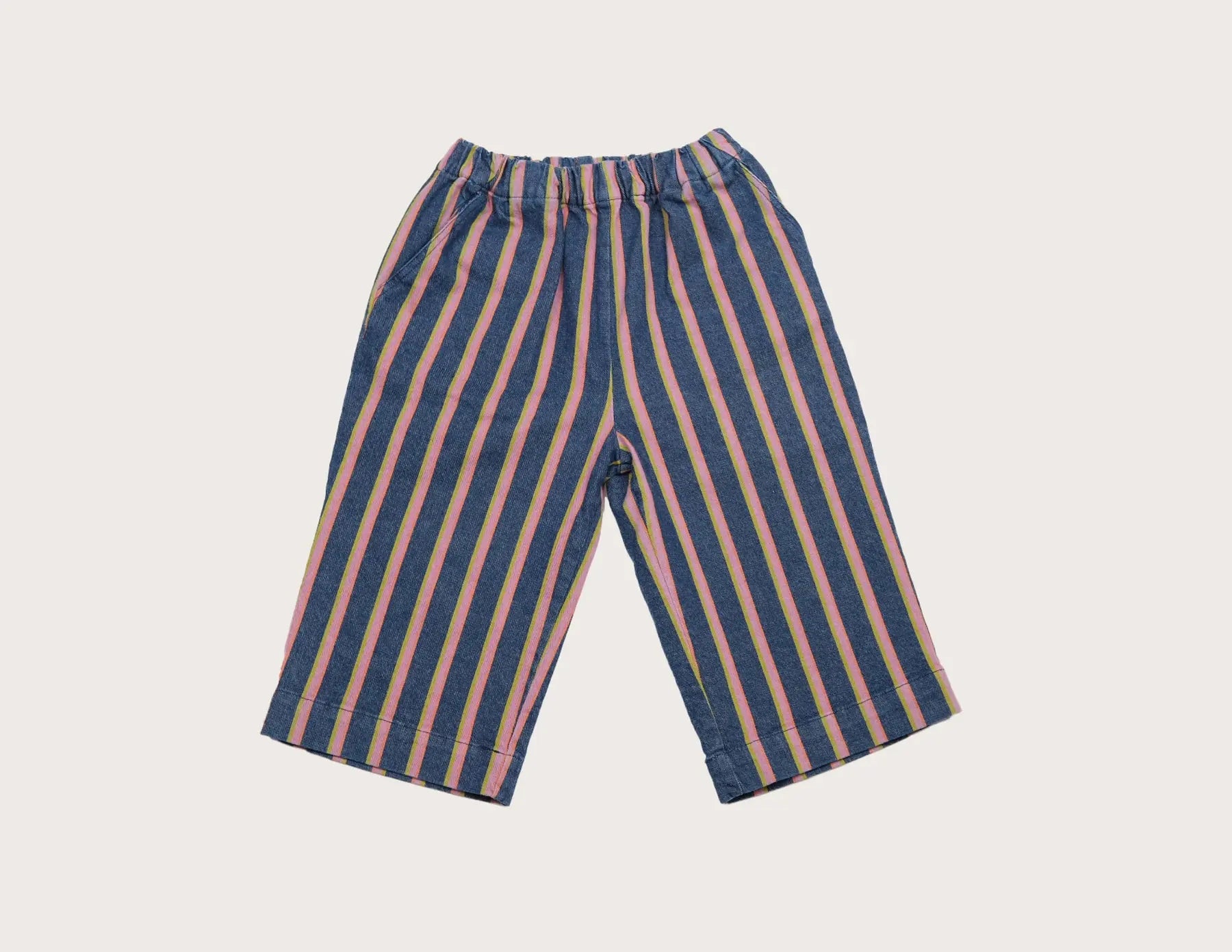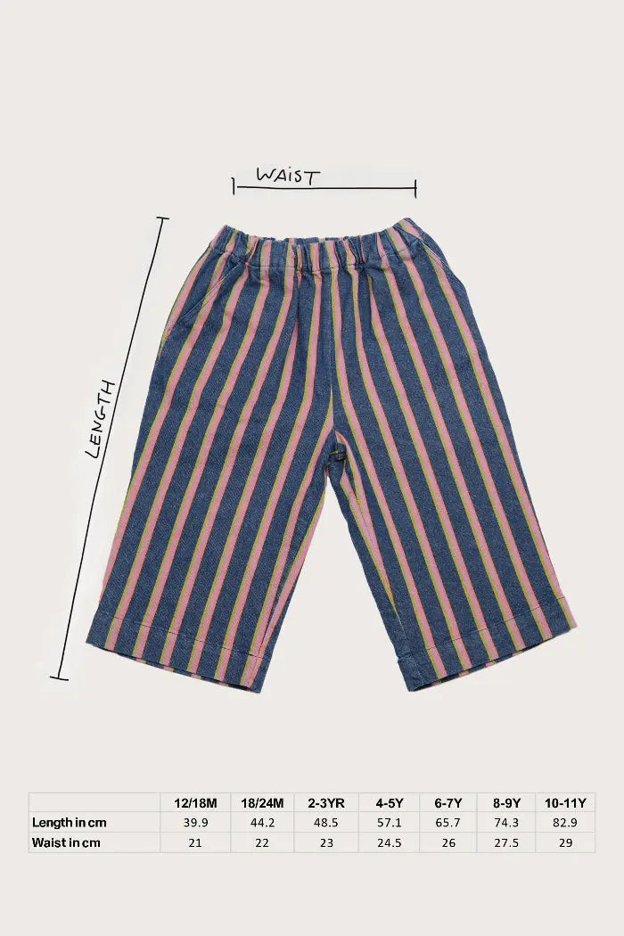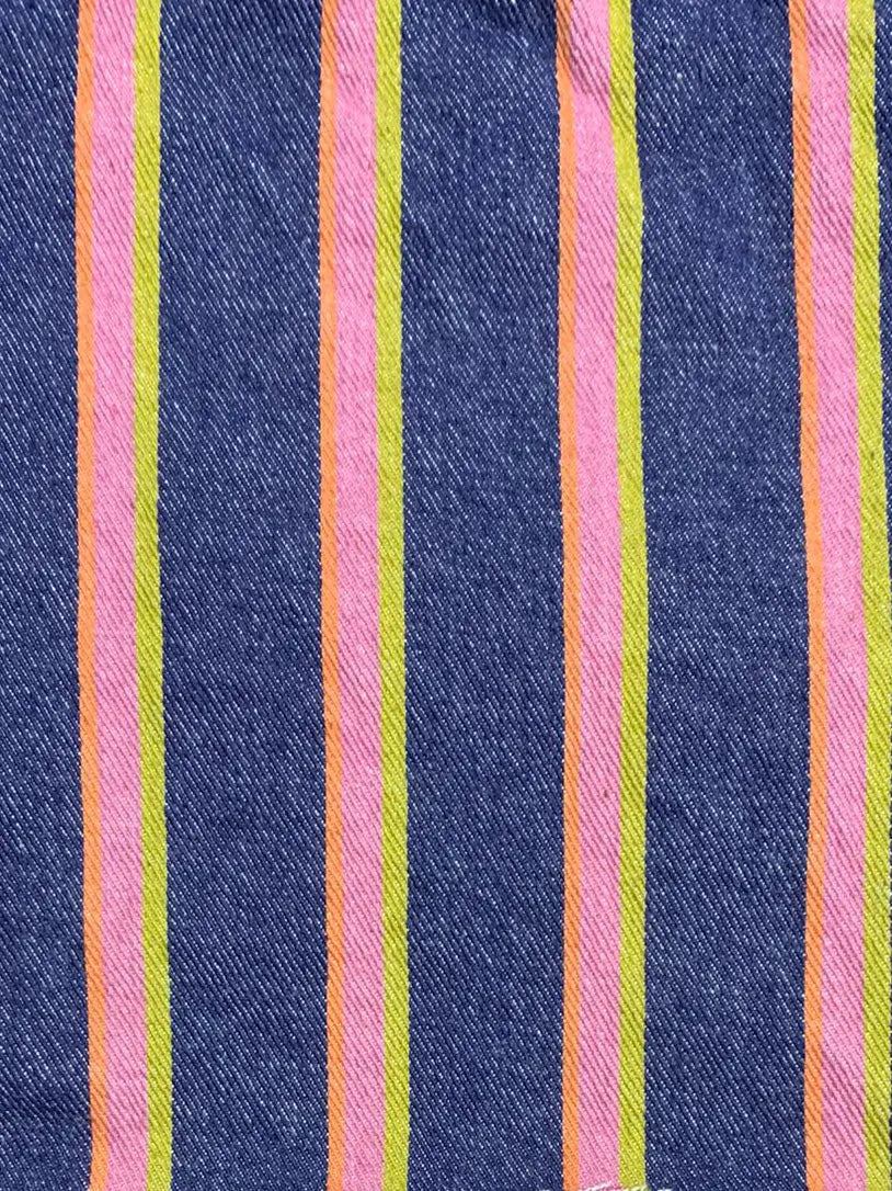 These wide-leg trousers feature a beautiful denim base with orange and pink yarn-dyed stripes, creating a timeless pattern that works for both everyday adventures and special occasions.
