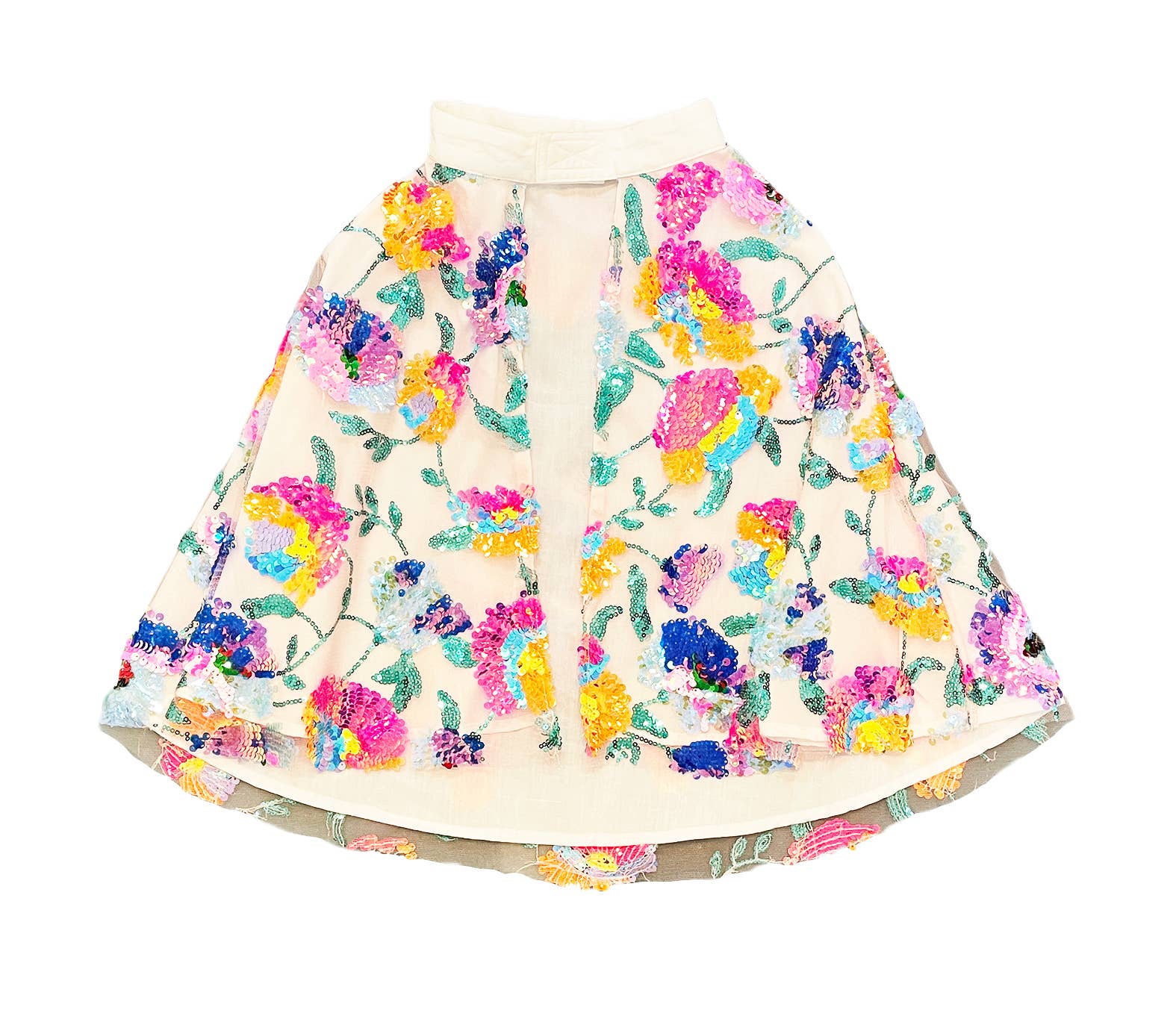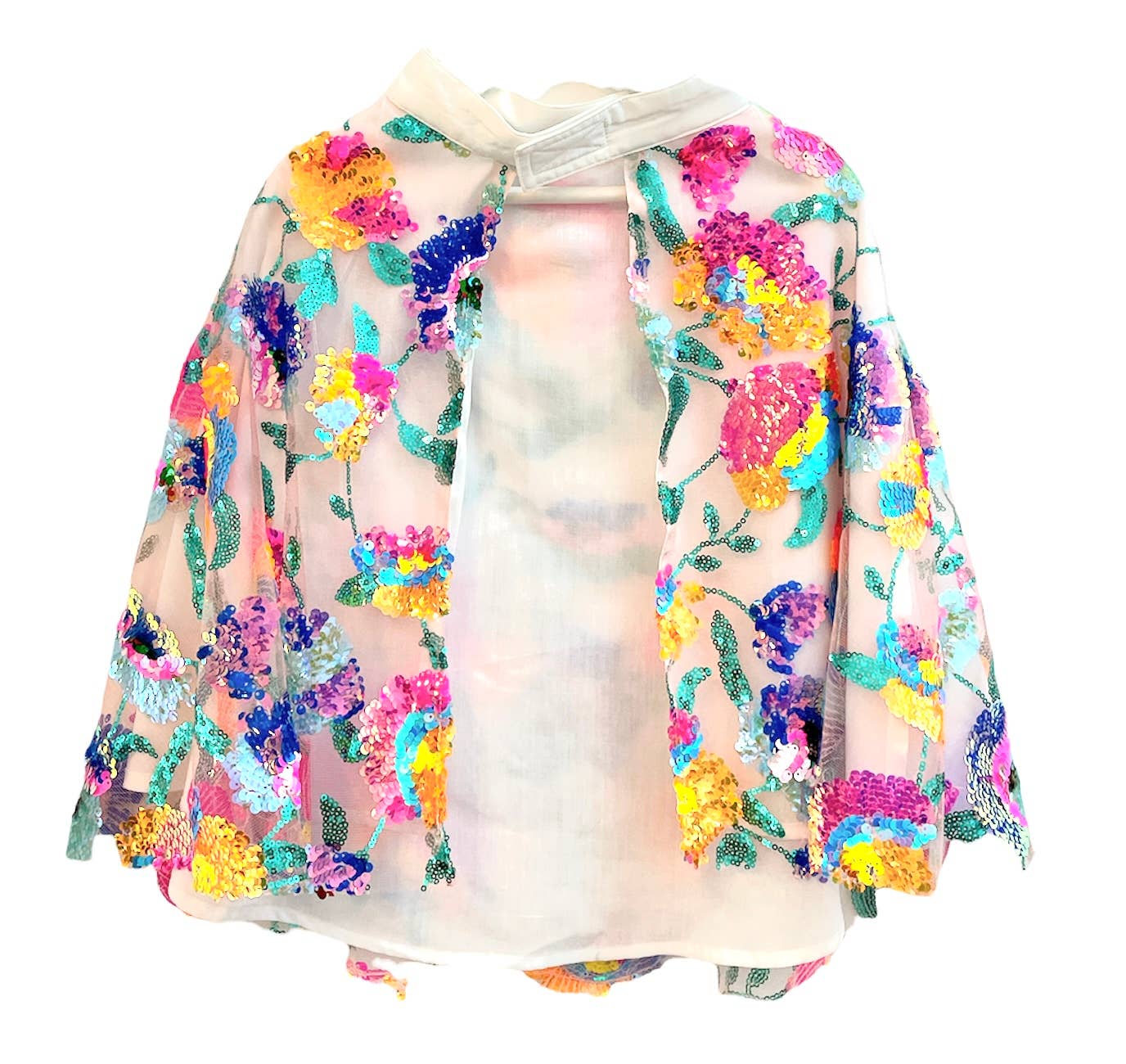The cape is embroidered with multicolored sequins and lined with cotton poplin.