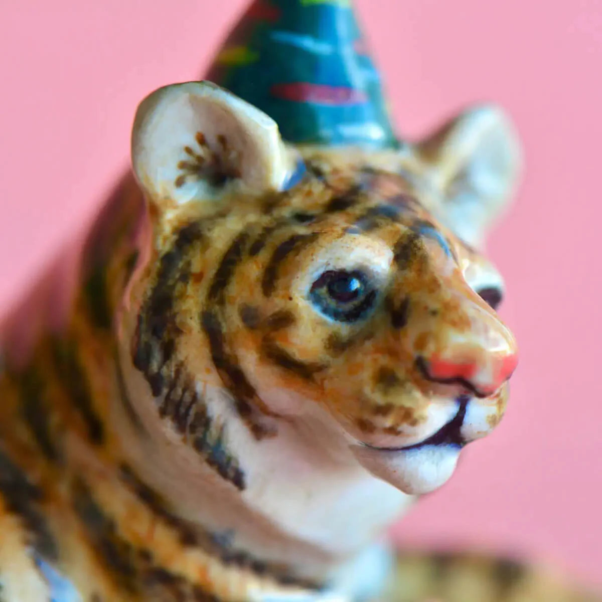 A fierce Tiger ceramic cake topper by Camp Hollow. Start a celebration with this Chinese zodiac inspired collectible keepsake, featuring a gold lustre cup that holds a standard size birthday candle. Crafted in fine porcelain and meticulously hand-painted, this beautiful heirloom quality candle holder will celebrate every birthday and occasion for years to come.
